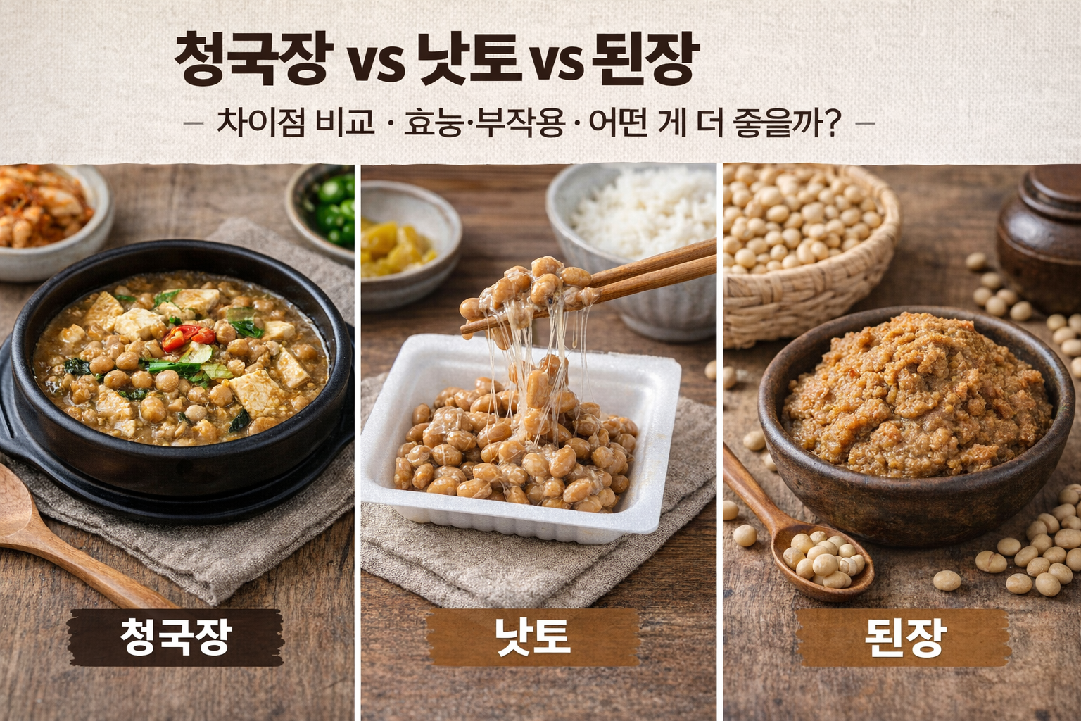 청국장·낫토·된장의 차이점을 한눈에 정리해보겠습니다.